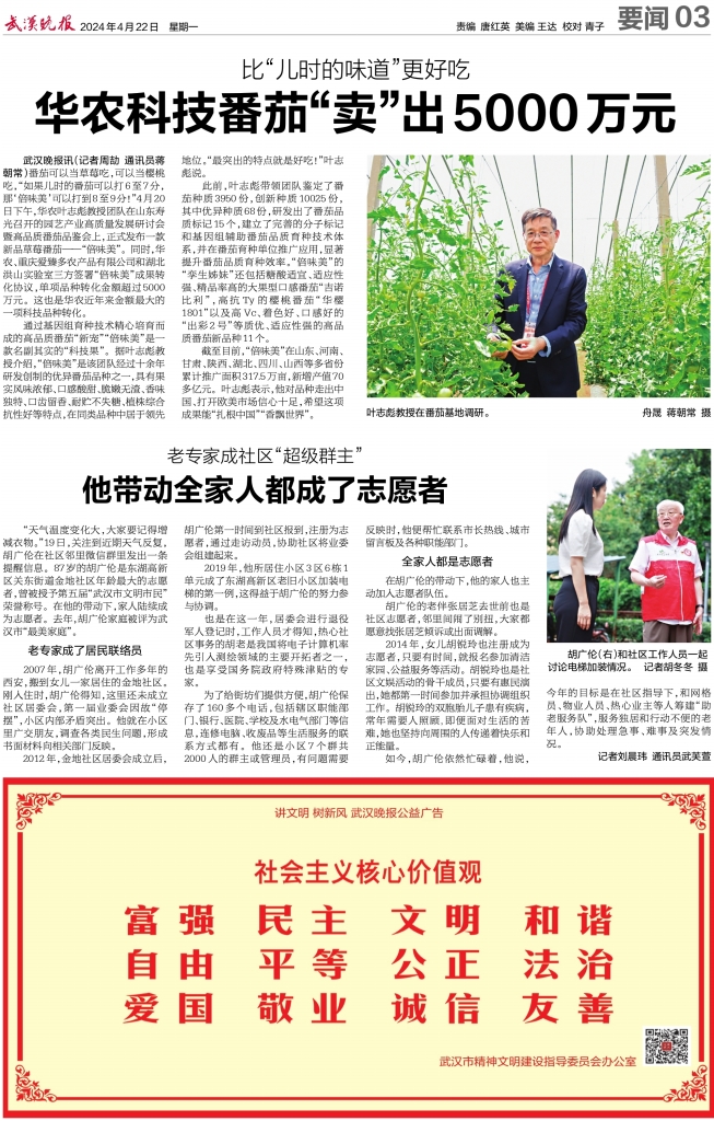 武汉晚报讯(记者周劼 通讯员蒋朝常)番茄可以当草莓吃,可以当樱桃吃,“如果儿时的番茄可以打6至7分,那‘倍味美’可以打到8至9分!”4月20日下午,华农叶志彪教授团队在山东寿光召开的园艺产业高质量发展研讨会暨高品质番茄品鉴会上,正式发布一款新品草莓番茄——“倍味美”。同时,华农、重庆爱臻多农产品有限公司和湖北洪山实验室三方签署“倍味美”成果转化协议,单项品种转化金额超过5000万元。这也是华农近年来金额最大的一项科技品种转化。