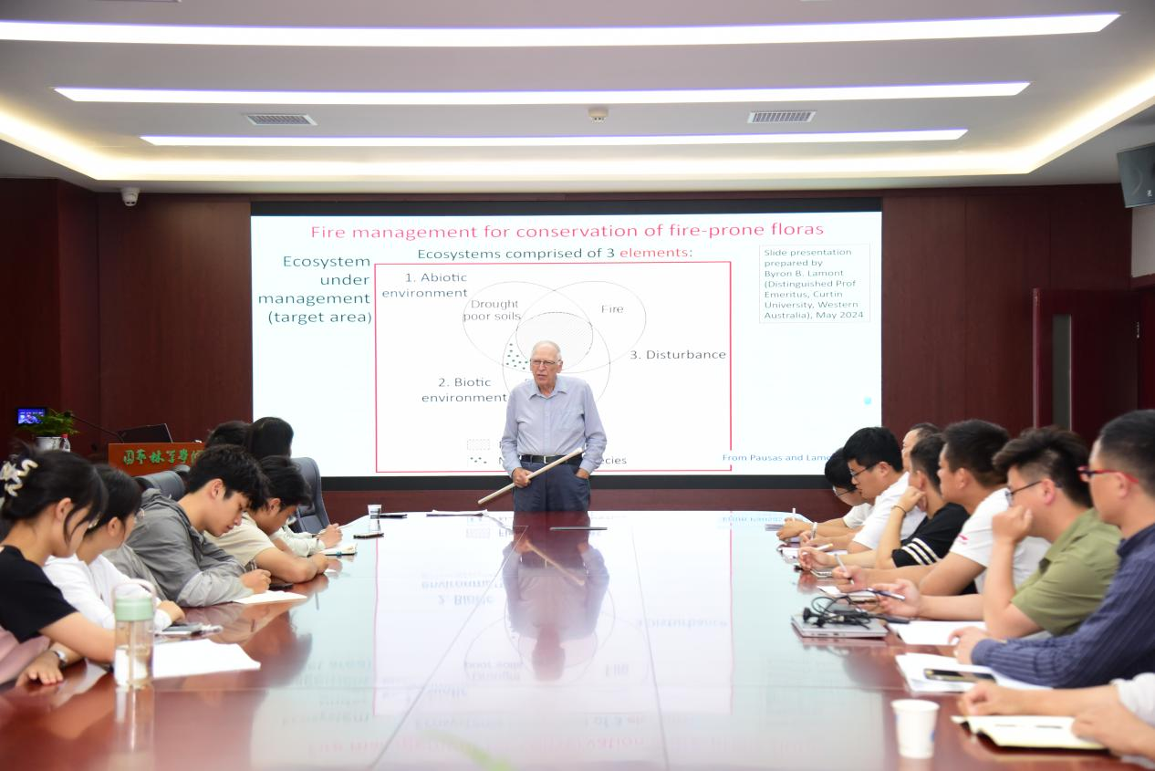 在两场报告会中Lamont教授分别以“Fire management for conservation of fire-prone floras”和“Fire and the evolution of plants”为题,为与会者带来了两场精彩的报告。报告深入探讨了在全球气候变化、人口增长以及易燃地貌不断扩大的背景下,如何对易发生火灾的植物区系进行科学的火灾管理,从而确保在火灾易发地区实施有效的管理程序,以保护珍贵的自然资源。Lamont教授首先介绍了全球气候变化对火灾易发地区的影响。随着全球气温的升高,干旱和极端天气现象愈发频繁,导致这些地区的火灾风险显著增加。同时,人口增长使得人类活动对自然环境的干扰加剧,进一步加剧了火灾发生的可能性。接着,教授详细阐述了易燃地貌的特征及其对火灾管理的挑战。这些地貌通常包括干草原、针叶林等,它们的植被结构、土壤条件以及气候条件均使得火灾易于发生和蔓延。在这样的地区,火灾管理面临着诸多困难,如难以预测火灾发生的时间和地点、火势蔓延速度快等。此外,Lamont教授还强调了保护自然资源的重要性以及探讨了火对于植物性状在火灾易发环境中的塑造和进化。在火灾易发地区,许多珍稀植物和动物面临着生存威胁。因此,在火灾管理过程中,需要充分考虑这些资源的保护。例如,可以通过合理规划土地利用、限制人类活动范围等方式,减少火灾对这些资源的破坏。在报告中,Lamont教授还引用了大量的统计数据和实证研究来支持自己的观点。他指出,近年来火灾频发,给自然环境和人类社会带来了巨大的损失。因此,加强火灾管理、保护自然资源已经迫在眉睫。