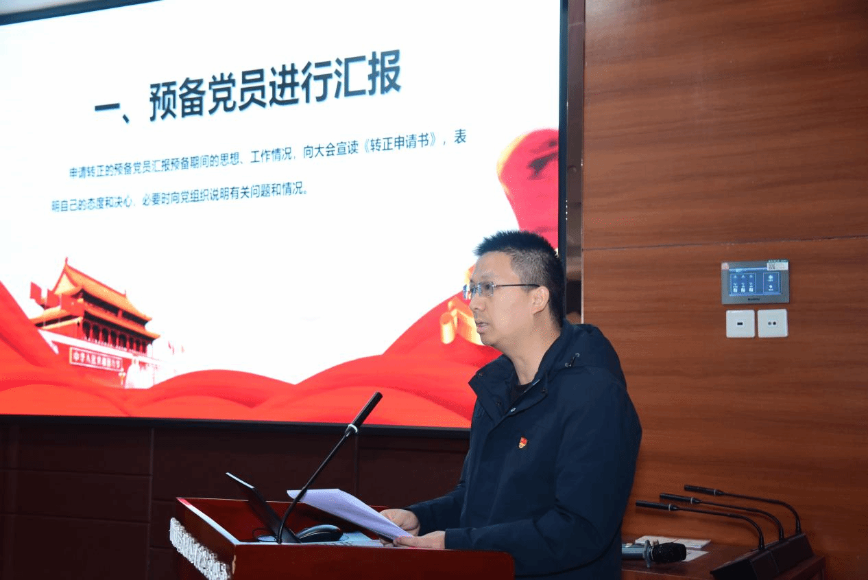 党支部书记、入党介绍人柴利军报告了潘志勇在预备期间的教育考察情况。随后,与会党员李国怀、叶俊丽、李昂、刘继红等同志对潘志勇多年来为学、为事、为人等表现发表意见,一致认为潘志勇入党动机纯、思想作风硬、工作成绩实、奉献精神足,符合党员标准。经无记名投票表决,同意潘志勇转为中共正式党员。