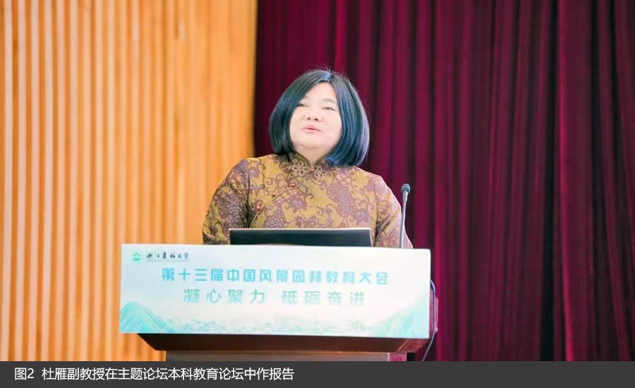 在14日下午的本科教育主题论坛中,杜雁副教授分享了题为《数字赋能,扎根大地:华中农业大学风景园林专业实践课程体系改革与思考》的报告。报告介绍了华中农业大学风景园林专业创建历史,以及高翅教授提出的“情∙境育人”教育理念,并从融贯爱国情操、社会情怀和专业情感的“三情”培植,到文化自信、责任担当和创新能力培养“三线合一”的专业整体教学理念和由此形成的以“全人教育”为目标的专通融合的课程教学体系、以项目为核心的关联课程群组织,以及所取得的系列教学成果。通过能力图谱建设、虚拟仿真教学等方式,创设多场景多通道实践教学系统,从“数、智、虚、实”等层面优化课堂场景和考核方式,通过政府、企业、社区、学校等多方联合指导学生完成一系列社区更新和微花园设计,实现学生互动化、主动化、深度化的学习方式。