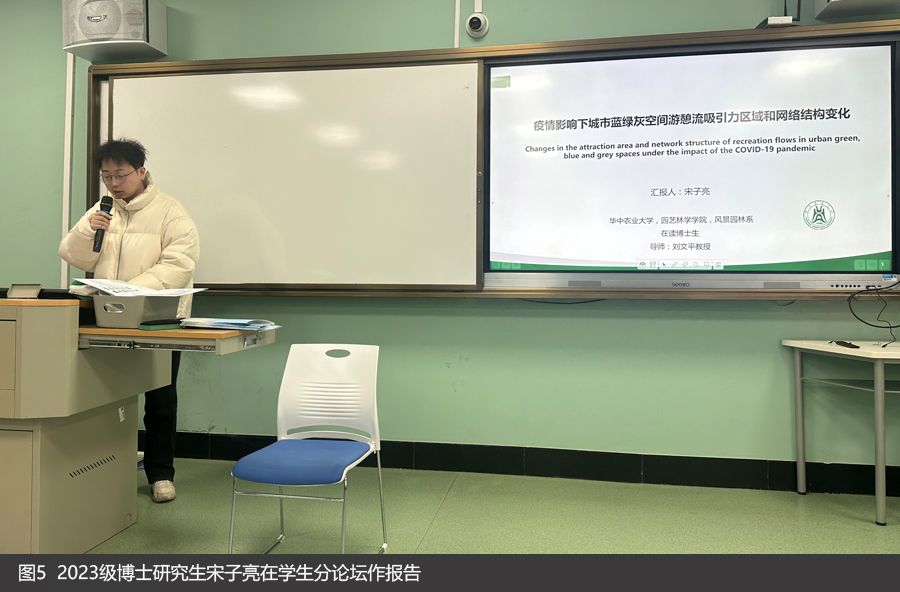 在学生分论坛中,2023级博士研究生宋子亮在景观生态论坛分享了题为”Changes in the attraction area and network structure of recreation flows in urban green, blue and grey spaces under the impact of the COVID-19 pandemic”的报告,通过分析疫情前后武汉市游憩空间的跨城市吸引力和城市内游憩流的变化情况,探究城市游憩体系应对疫情的韧性。研究结果表明跨城游憩流吸引力方向未变,武汉市游憩路径在疫情后变得简化,发挥重要功能的灰色空间在游憩流网络中受疫情影响较小,这些发现对于旅游部门和景区管理者在平衡疫情防控与休闲需求的策略制定中具有指导意义。2023级博士研究生朱亚斓在史论遗产论坛分享了题为”Poetic City--A Study on the Ancient City’s Jing of Xiangyang Based on Poetry Analysis”的报告,解析描写古城风景的古诗词,理解其城境的组成内容和生成逻辑,然后解读现存空间,对城市意境的现代延续进行把脉。诗人更倾向于着墨于山、水之势中的襄阳古城,创造宏观尺度的城市风景意境,而这种山水之态在当下依存。若要全面延续城境,总体尺度上应清淤去塞、畅联山水融城之势;中观尺度上需景境统筹,明晰风景保护之态;并在微观层面引入登临点、驻足处、视景廊和山水线等。研究旨在通过诗境溯源城市意境,以促进城市发展的所有相关者就城市风景意境的认知达成共识,并提供一种基于中华文化思维方式的古城可持续规划思路。