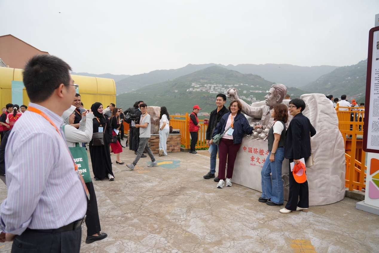 在秭归县水田坝乡,采购商在章文才教授雕像前合影 晏华华摄