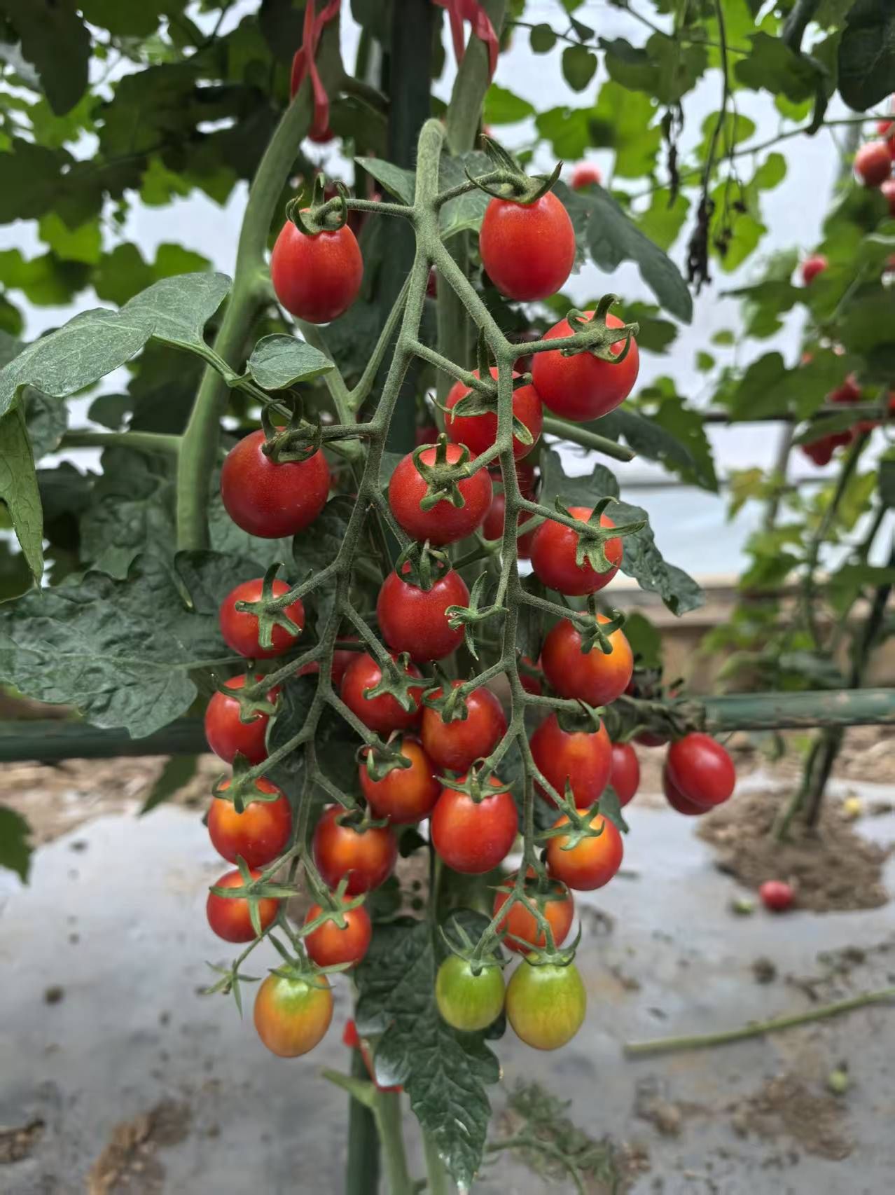 “华樱40”是八八看球 番茄团队经过多年潜心研究培育出的新品种。其突出的特点就是好吃,高温下糖度高且稳定。该品种属无限生长型,植株生长势强,中早熟,花序间隔节位3。果实亮红色,香味浓郁,平均单果重15-20g,可溶性固形物11%,平均产量每亩超过4000kg,无论是口感还是产量,都深受消费者和种植户的广泛青睐。