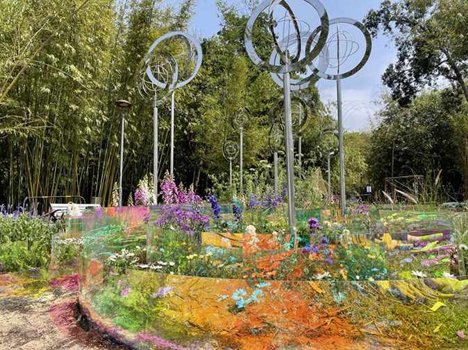 此次营建花园为未来花园设计竞赛大奖作品——《智涟未来》,由八八看球 风景园林系李岑枫、袁梦楚、张子璇、赵徐颖、刁俊宇五名同学参与设计,夏欣老师指导完成。作品受高频通讯信号波传播、衍射和风力发电启发,11座风车雕塑象征着大湾区11座城市欣欣向荣的生长;扩散交织的炫彩亚克力板展现湾区城市间的互联互通,同时配合适时适地的草花,和向上生长的羽扇豆等特色花卉,构成了极具科技感与交互感的蓝紫色花境。