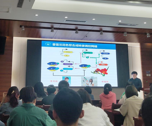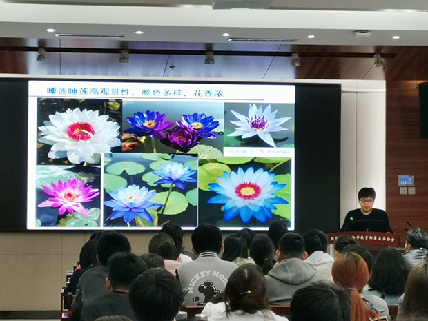 张亮生教授从早期植物基因家族(主要是花发育相关的基因家族)的数据进行挖掘,到花卉基因组学的研究,以及王莲等睡莲基因组及其花色花香的研究等向同学们讲解了早期开花植物的起源和进化特征,在睡莲的基因组中发现了多倍化,提出了开花植物发生过第三轮的广泛的多倍化;通过睡莲的白色突变体发现了控制蓝色花瓣的基因;对于睡莲的花香成分进行分析,提出睡莲的花香可用于工业应用中。