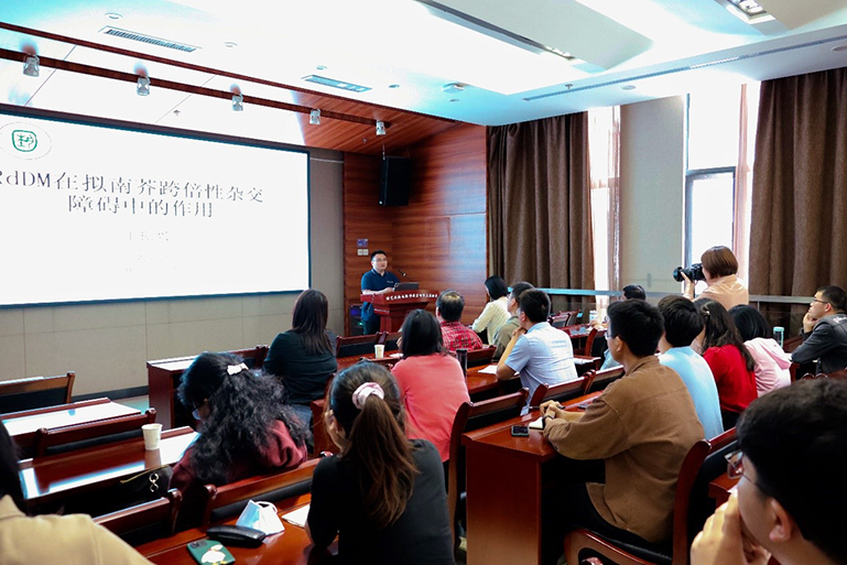 王博士曾在德国柏林自由大学和瑞典农业科学大学从事博士后研究,探讨拟南芥跨倍性杂交障碍和有性生殖发育的表观调控机制。此次报告详细介绍了RNA介导的DNA甲基化(RdDM)在调控拟南芥跨倍性杂交障碍中的作用,即RNA聚合酶IV(Pol IV)通过调控三倍体种子胚乳中21-22 nt和24 nt小RNA的平衡,影响印记基因表达,进而调控胚乳和种子发育。通过二倍体拟南芥与RdDM途径重要成员的功能缺失突变体以及产生2n花粉的减数分裂异常突变体之间的杂交,证实RdDM途径的多个成员在拟南芥父本基因组超剂量的三倍体杂交障碍中起关键作用,且RdDM突变体恢复三倍体种子育性的作用具有跨代效应。在提问环节,师生们就怎样深入研究园艺作物杂交障碍机理以及如何提高倍性杂交和远缘杂交育种效率等问题与王博士展开了深入讨论和交流。会后王博士还与果树、园林系师生进行座谈,为研究生课题提出了宝贵建议。