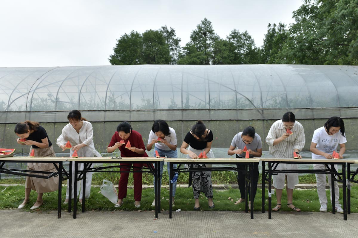 与此同时,广场另一侧的吃西瓜大赛也正在如火如荼地进行着,选手们列成一排,在观众的欢呼声中比拼吃下预先准备好的西瓜。在品尝师生劳动成果的同时也不忘节约适度,既保证了趣味性,也向身边的人传递着节约粮食的生活理念。