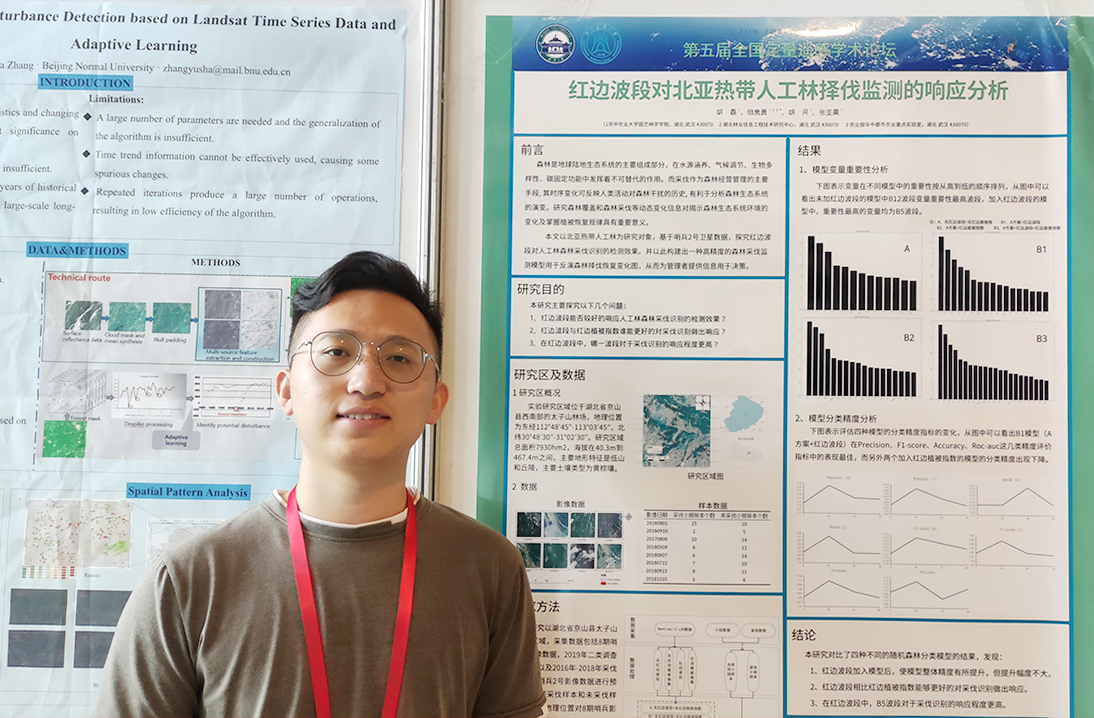佃袁勇副教授和共同承担了“森林干扰遥感监测与预警“分会场召集与主持工作。该分论坛邀请了北京林业大学黄华国教授、中国林科院庞勇研究员、福建师范大学陆灯盛教授、西南林业大学寇卫利教授等国内外知名学者做了精彩报告。清华大学、南京大学、华中师范大学、安徽大学、西南林业大学、南京林业大学、内蒙古工业大学等大学参加该分论坛,针对森林虫害、火灾、采伐等扰动,围绕遥感技术提取扰动信息、评估生物量变化等方面做了精彩报告。佃袁勇与孟冉老师还针对森林病虫害遥感监测做了“基于遥感与地理信息的马尾松材线虫病害木空间分布模式研究”、“融合光谱和时序特征的南方松树甲虫(SouthernPineBeetle)虫害探测模型研究”的专题报告。佃袁勇老师的林业遥感课题组硕士研究生胡磊、胡月、张亚昊、刘晓阳也参加了此次论坛,并制作了题为“红边波段对北亚热带人工林择伐监测的响应分析”的海报展示。