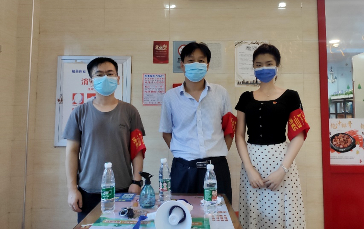 教师党员刘文平、万正杰与学生党员沈玥在美食城执勤(周长剑 摄)