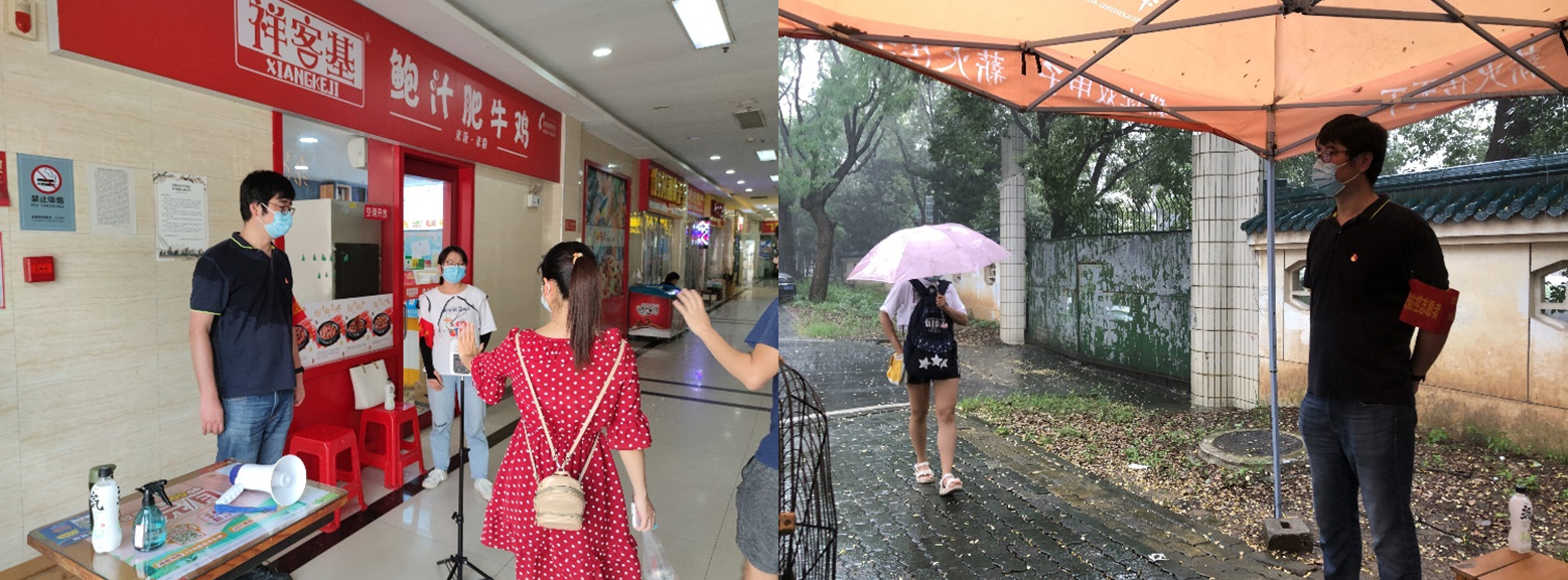 伴随着淅淅沥沥的小雨,教师党员腾明君、学生党员李楚婷和学生党员韩福踏上了前往步行街的路。由于天气原因,美食城来往的客人不是很多,进出次数最多的是外卖小哥,尽管全身湿透,外卖小哥仍然一次次重复测着体温。滕明君老师从到达岗位之后就再也没有停下,交接、指挥、测量体温,汗水浸湿了他的上衣,他只是笑了笑,表示没有问题。