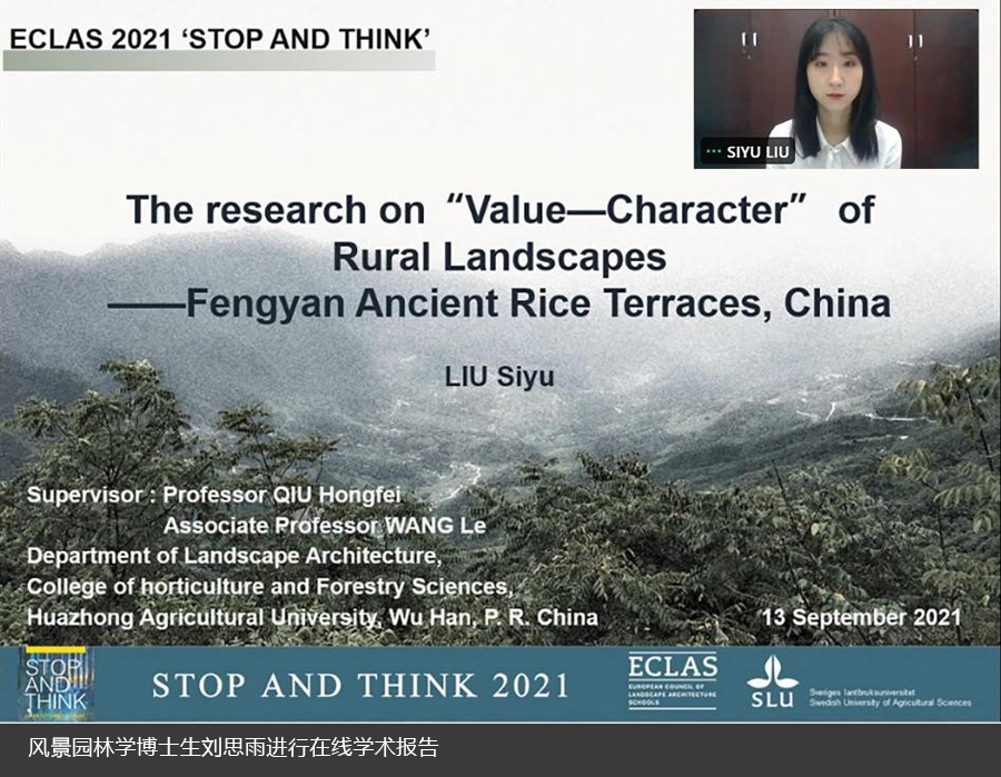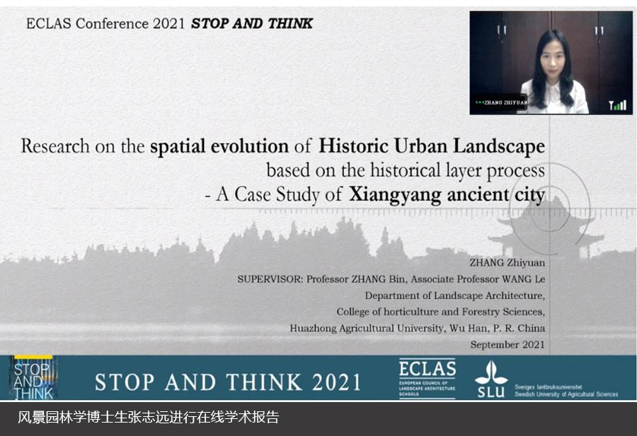 2021年9月13-15日,由欧洲风景园林高校理事会(ECLAS–“European Conference of Landscape Architecture Schools”)主办的“ECLAS Conference 2021 Online”在线召开。本次大会主题为“STOP AND THINK”,设有9个分论坛,包括Climate Change and Adaptation、Cultural Landscape、Design History, Theory and Methods、Education and Pedagogy、Green Landscapes and Living、Our Field and Profession、Societal Context、Urban and Rural、Independent Sessions。华中农业大学风景园林学博士生张志远、刘思雨受邀参会,分别参加了13日的学术报告以及15日的博士生论坛。