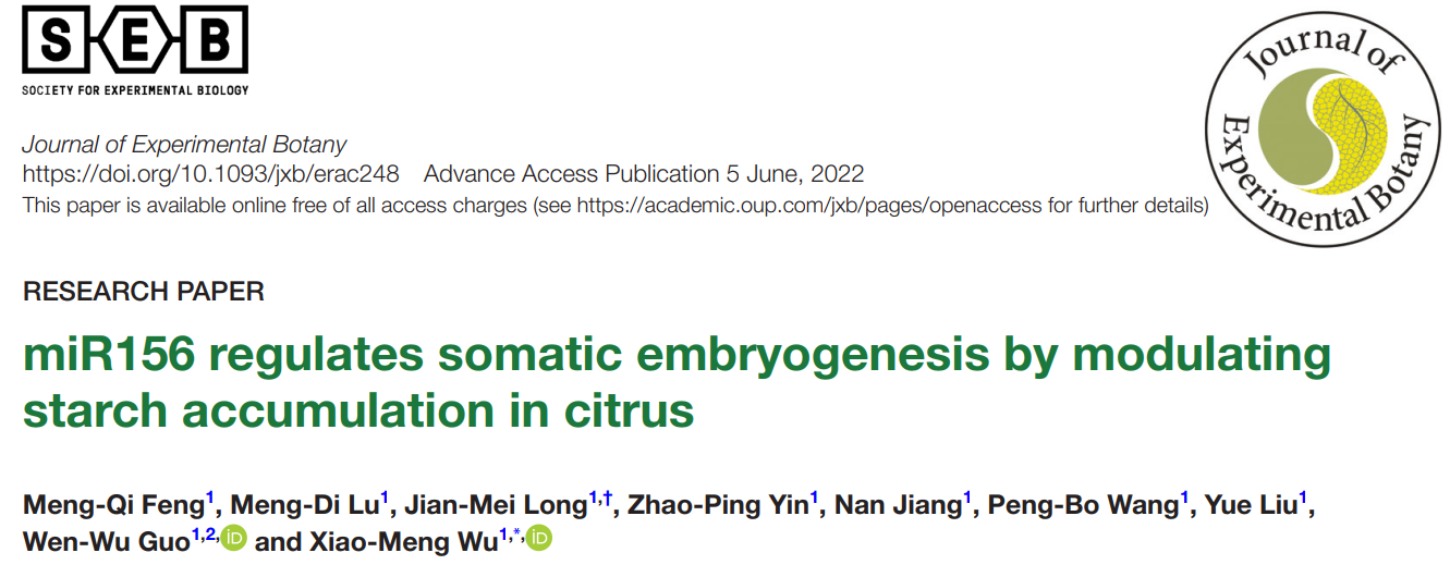 近日,Journal of Experimental Botany发表了华中农业大学园艺植物生物学教育部重点实验室柑橘研究团队题为“miR156 regulates somatic embryogenesis by modulatingstarch accumulation in citrus”的研究论文。该研究发现CsMIR156A受到上游转录因子CsAGL15和CsFUS3的调控,miR156/SPL再通过调控miR172/TOE介导淀粉积累从而影响柑橘体细胞胚发生。该研究解析了miR156调控体细胞胚发生的上下游通路,提出了新的调控模型。