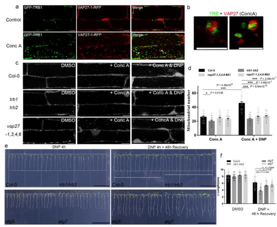 近日,华中农业大学园艺教育部重点实验室、湖北洪山实验室王鹏蔚教授联合英国杜伦大学Patrick J Hussey教授实验室在Nature Communications发表题为TraB family proteins are components of the ER-Mitochondrial contact sites and regulate ER-Mitochondrial interactions and mitophagy的研究论文(图1)。该研究解析了一种新型的EMCS复合体,包括线粒体外膜蛋白TRB1,TRB2和内质网膜蛋白VAP27-1。TRB与VAP27相互作用,调节线粒体与内质网的连接、线粒体形态与功能。TraB家族有三种亚型,即TRB1, TRB2,和TRB3;其中TRB1的线粒体定位在拟南芥、柑橘等高等植物中十分保守。拟南芥trb1/trb2双突变体表现出线粒体形态异常、淀粉积累强烈和能量代谢受损,说明这些蛋白质对正常的线粒体功能至关重要(图2)。此外,TRB1和TRB2蛋白也与ATG8相互作用,以调节线粒体自噬。在正常生长条件下,在Col-0和trb1/trb2中发现液泡内的线粒体数量相似,但是当这些植物遭受线粒体胁迫时,两种突变体中线粒体自噬的效率均显著的受到了抑制,胞质内去极化线粒体数量增多,液泡内线粒体积累的数量减少,胁迫后植物的恢复受到显著干扰(图3)。拟南芥vap27多突变体也有类似的表型,因此推测,TRB1调节线粒体自噬和内质网-线粒体相互作用是两个密切相关的过程,而TraB家族蛋白具有双重作用,其一是真核生物EMCS复合体的组成部分,其二可调节内质网线粒体相互作用以及线粒体自噬。