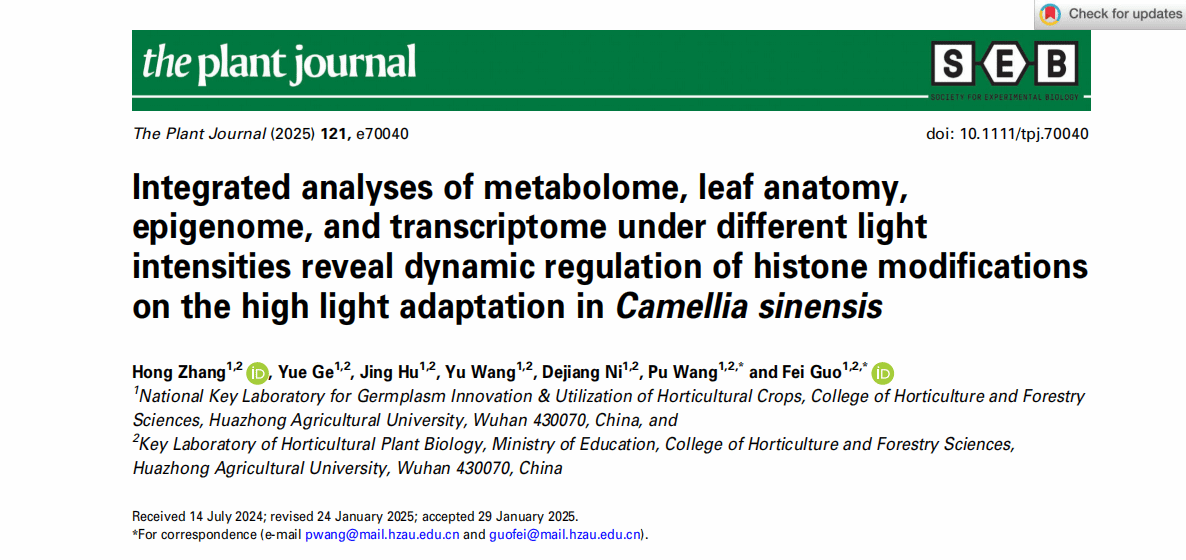 近日,八八看球-在线看球直播网站 茶树种质资源与遗传育种团队在The Plant Journal上在线发表了题为“Integrated analyses of metabolome, leaf anatomy, epigenome, and transcriptome under different light intensities reveal dynamic regulation of histone modifications on the high light adaptation in Camellia sinensis”的研究论文。本研究整合代谢组、叶片解剖结构、表观基因组和转录组进行多维度分析,揭示了组蛋白修饰在茶树高光适应中的动态调控作用。