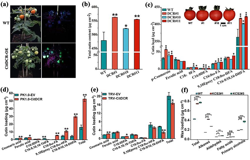 进一步通过柑橘果实的瞬时过表达、VIGS以及稳定转化番茄,证实CitDCR参与角质单体9/10,16双羟基十六烷酸的合成,调控角质积累;在拟南芥中异源过表达CitKCS2促进叶片蜡质积累,尤其是烷烃类蜡质含量显著升高(图4)。