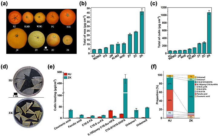 角质层是植物抵御外界生物和非生物胁迫的重要屏障,主要由角质和蜡质组成,在降低果实失水、减少果实裂果和抵御病原侵染等方面发挥着至关重要的作用。然而,受限于角质层分离体系的复杂性以及缺乏理想研究材料,柑橘果实角质层的形成机制及其调控网络仍不清晰。