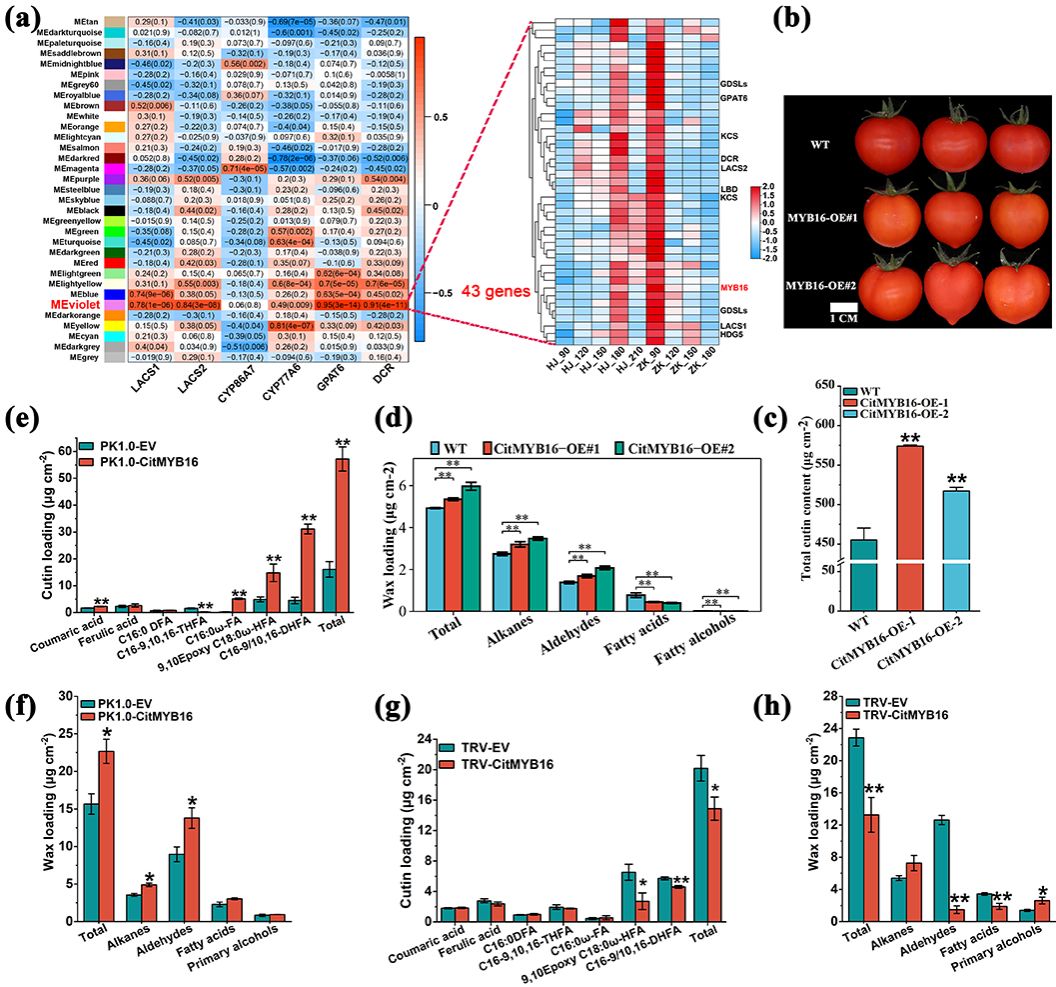 为深入解析角质单体9/10,16双羟基十六烷酸在枳中高度积累的分子机制,我们结合加权基因共表达网络分析(WGCNA)和相关性分析,鉴定出与角质层形成密切相关的关键转录因子CitMYB16,其在枳果实中的表达水平显著高于红橘。通过柑橘果实的瞬时过表达、病毒诱导的基因沉默(VIGS)以及稳定转化番茄,发现CitMYB16不仅促进角质积累,同时也促进蜡质合成,具备双重调控能力(图2)。