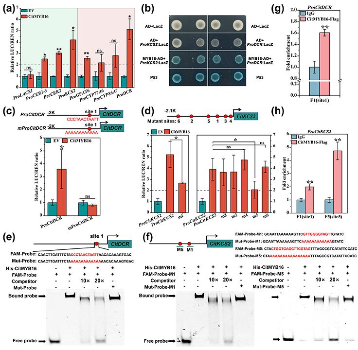 随后,通过双荧光素酶报告实验初步筛选出5个可能受CitMYB16调控的下游靶基因(CitCER1-3、CitCER2、CitKCS2、CitGPAT6和CitDCR);酵母单杂交实验表明,CitMYB16仅与CitDCR和CitKCS2的启动子存在相互作用。对靶基因启动子中预测的MYB结合位点进行定点突变,结合电泳迁移率分析(EMSA)和染色质免疫沉淀(ChIP-qPCR)等实验证实,CitMYB16可直接结合并激活CitDCR和CitKCS2的启动子,从而正向调控其表达(图3)。