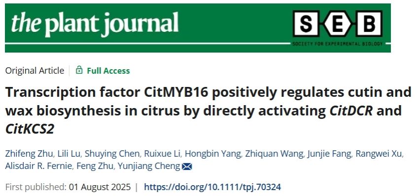 近日,华中农业大学八八看球 、果蔬园艺作物种质创新与利用全国重点实验室和湖北洪山实验室程运江教授课题组在The Plant Journal发表了题为“Transcription factor CitMYB16 positively regulates cutin and wax biosynthesis in citrus by directly activating CitDCR and CitKCS2”的研究论文。该研究系统解析了CitMYB16在柑橘果实角质层形成中的关键作用,揭示其通过激活CitDCR和CitKCS2,调控角质与蜡质合成的分子机制。该研究不仅拓展了果实角质层形成的调控网络,也为提升柑橘果实抗逆性和贮藏保鲜性能提供了理论依据。