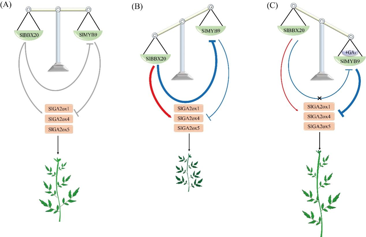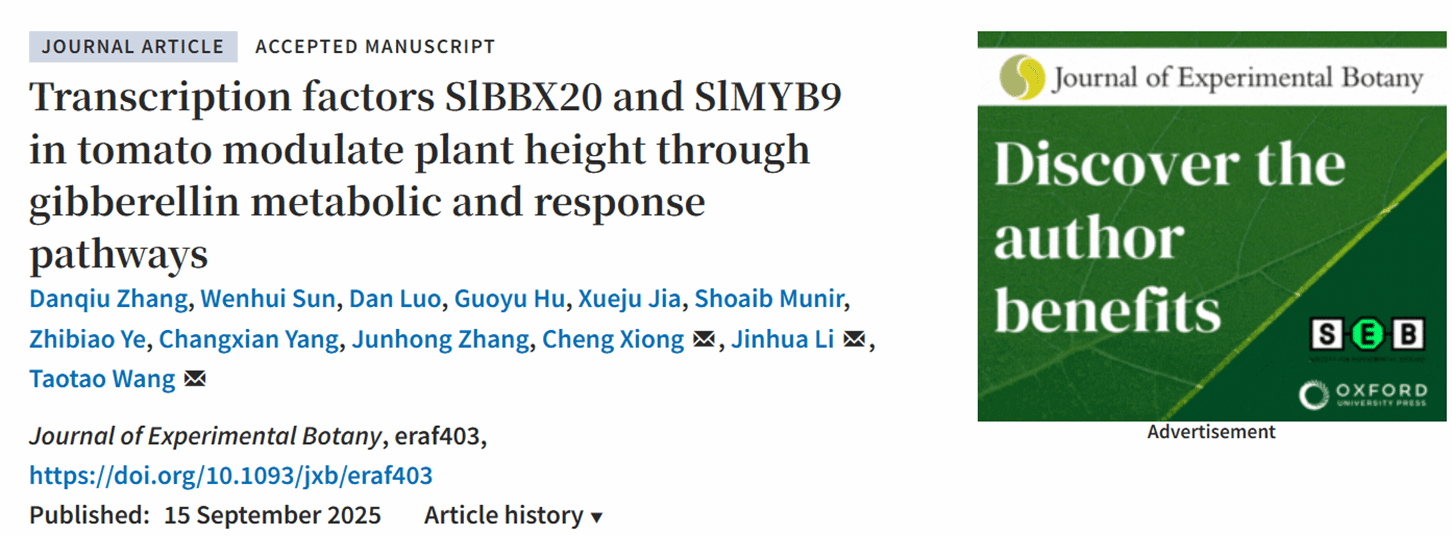 近日,八八看球-在线看球直播网站 、果蔬园艺作物种质创新与利用全国重点实验室王涛涛课题组在Journal of Experimental Botany 在线发表了题为“Transcription factors SlBBX20 and SlMYB9 in tomato modulate plant height through gibberellin metabolic and response pathways”的研究论文。该研究揭示了一个调控番茄株高的新模型——SlBBX20和SlMYB9通过维持GA代谢和响应途径之间的平衡来共同调节番茄植株高度。