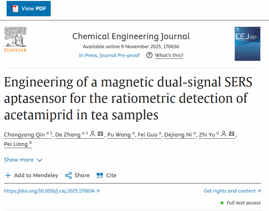 近日,八八看球-在线看球直播网站 、果蔬园艺作物种质创新与利用全国重点实验室倪德江教授团队张德副研究员和余志副教授在国际学术期刊Chemical Engineering Journal上在线发表了题为“Engineering of a magnetic dual-signal SERS aptasensor for the ratiometric detection of acetamiprid in tea samples”的研究论文。本研究提出了一种可以在茶叶复杂基质中高效磁性富集、快速、特异性检测啶茶叶中虫脒农药残留的有效策略,为保障茶叶质量安全奠定了研究基础。