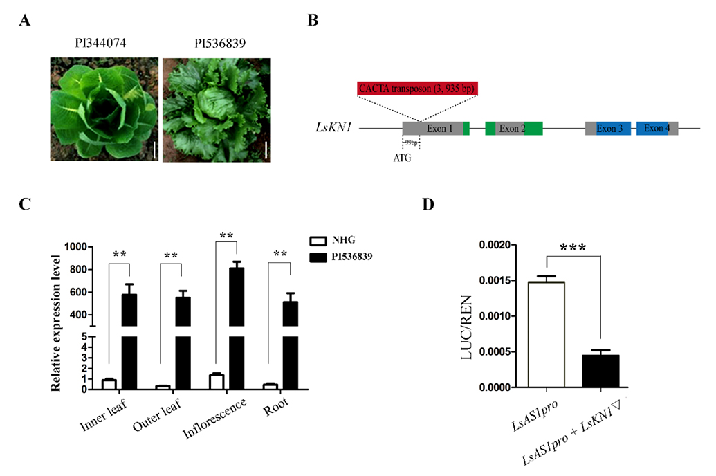 (C)转座子插入后LsKN1在不同组织中的表达均大幅提高。NHG,为不结球生菜。(D)LsKN1▽抑制LsAS1基因得表达,从而形成结球性状。