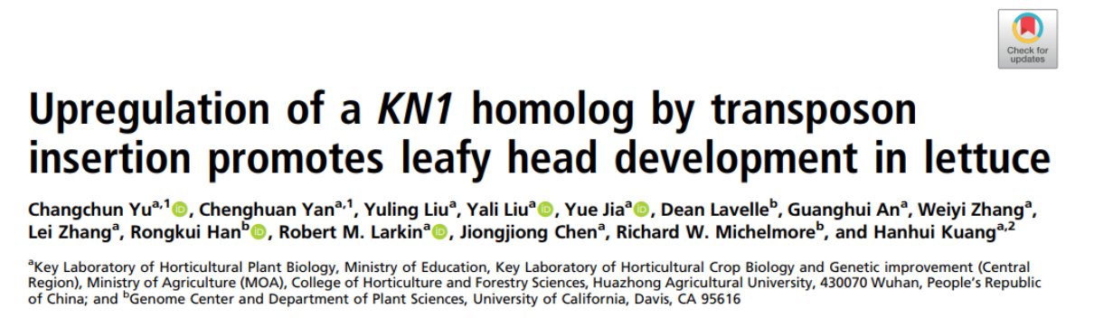 近日,华中农业大学园艺植物生物学教育部重点实验室匡汉晖课题组在PNAS杂志上发表题为“Upregulation of aKN1homolog by transposon insertion promotes leafy head development in lettuce”的研究论文,该论文首次报道了生菜中控制结球性状基因LsKN1的克隆,并在分子水平上阐述了LsKN1调控生菜结球的作用机制。