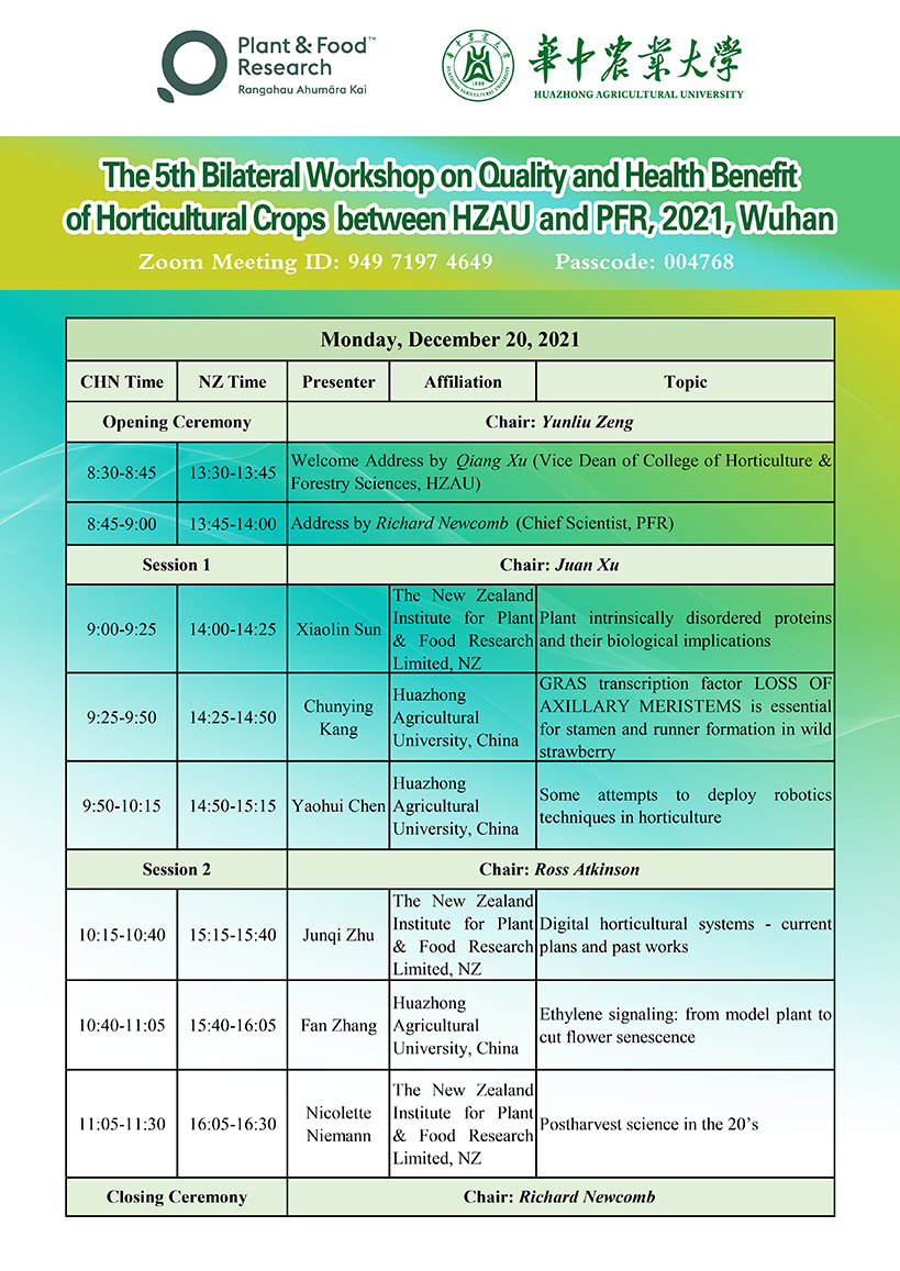The 5th Bilateral Workshop on Quality and Health Benefit of Horticultural Crops between HZAU and PFR,2021,Wuhan