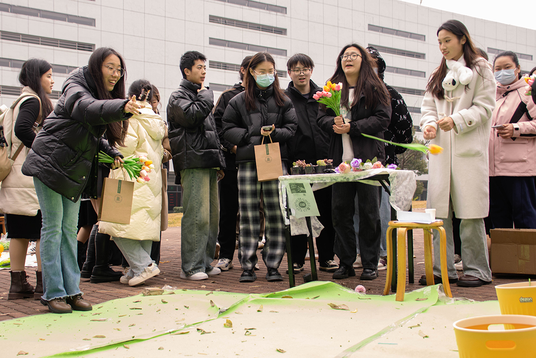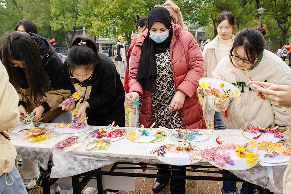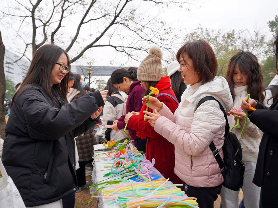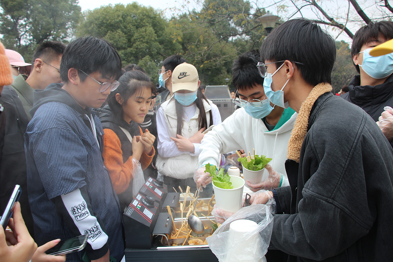 橘子灯、压花书签、植物拓印、扭扭棒花卉、锦花团扇、创艺花环、茶点心等制作体验区围满了人,大家在活动组织同学的指导下,发挥着自己的才能,创作出属于自己的作品。热气腾腾的烤红薯、香味扑鼻的关东煮、鲜红喜人的糖葫芦、奶香四溢的围炉奶茶则给大家在寒冷中带来一丝温暖。