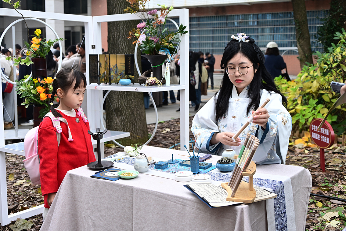 “清泉流齿寒橘香”由香芷雅集团队郑日如老师指导的硕士研究生张若馨正在为大家展示香篆礼仪。松灰、压灰、扫灰、放篆、打篆、起篆、燃篆,运用独特的香料和打香技巧,呈现出精妙的香篆。此次香料根据芳香植物特色和学科优势,特色定制设计而成,有柑橘、月季、桂花、梅花、樱花等多种香型,旨在融汇学科特色,突出校园文化,为大家带来独一无二的香气享受。一招一式让在场师生连连称赞。