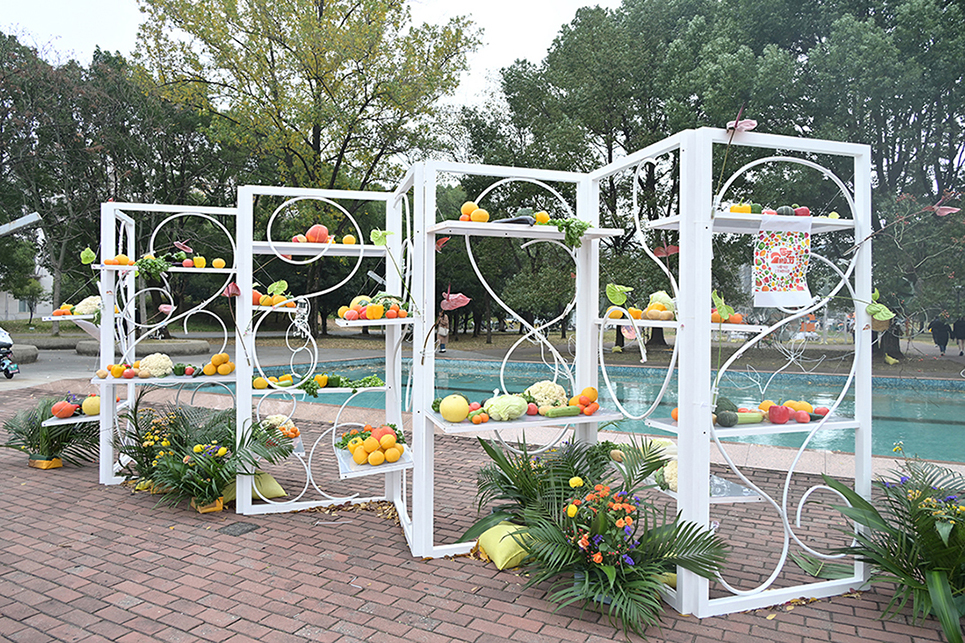 “花田园艺、架构花屏、明镜飞花”由王媛媛老师团队倾力打造,作品匠心独运,利用圆形钢架做固定造型,将一支支鲜花、一片片绿叶、一根根枝条融入其中。每一朵花都有自己独特的风格和情感,构造出一幅富有灵性的画卷。在花架上,装满蔬果的果篮子、菜篮子错落排放,雏菊、马蹄莲装点其间,花菜、西兰花、彩椒、番茄、南瓜、茄子……七彩多样的蔬菜展示在人们面前,构成一幅生机盎然的园艺画卷。
