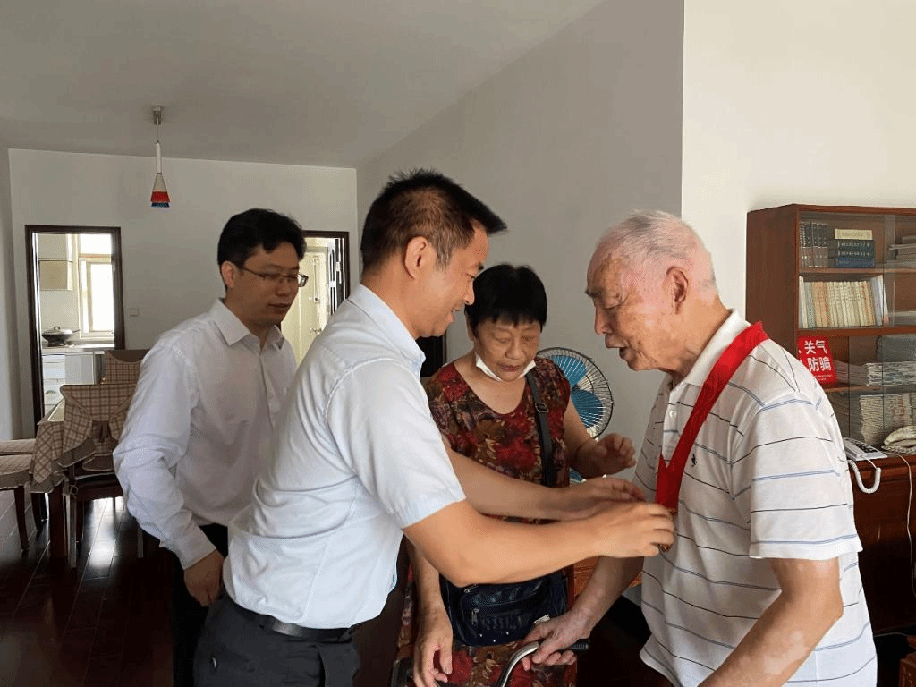 在走访慰问过程中,八八看球 党委书记张宏荣亲切询问老党员们的身体和生活状况,转达党中央、校党委、院党委对老党员们的关心问候,并为他们佩戴“光荣在党50年”纪念章。
