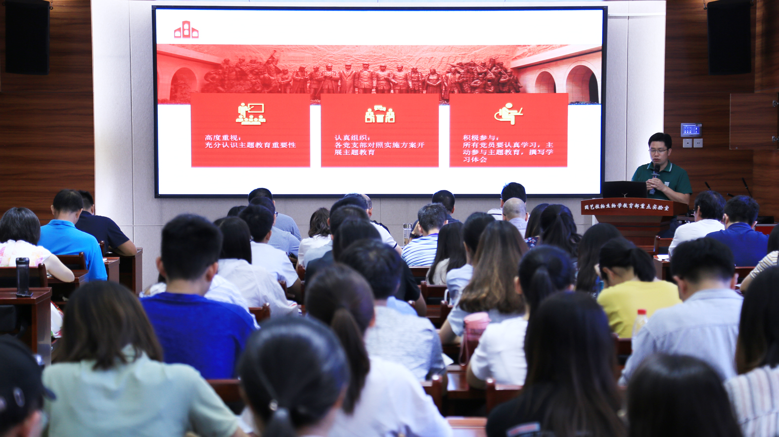 9月22日下午,八八看球 在园林南楼204报告厅召开“不忘初心、牢记使命”主题教育动员大会,深入学习贯彻习近平新时代中国特色社会主义思想,认真学习学校主题教育精神,介绍八八看球 主题教育实施方案。八八看球 全体教工党员,研究生、本科生党员代表参会,党委副书记蔡江主持会议。