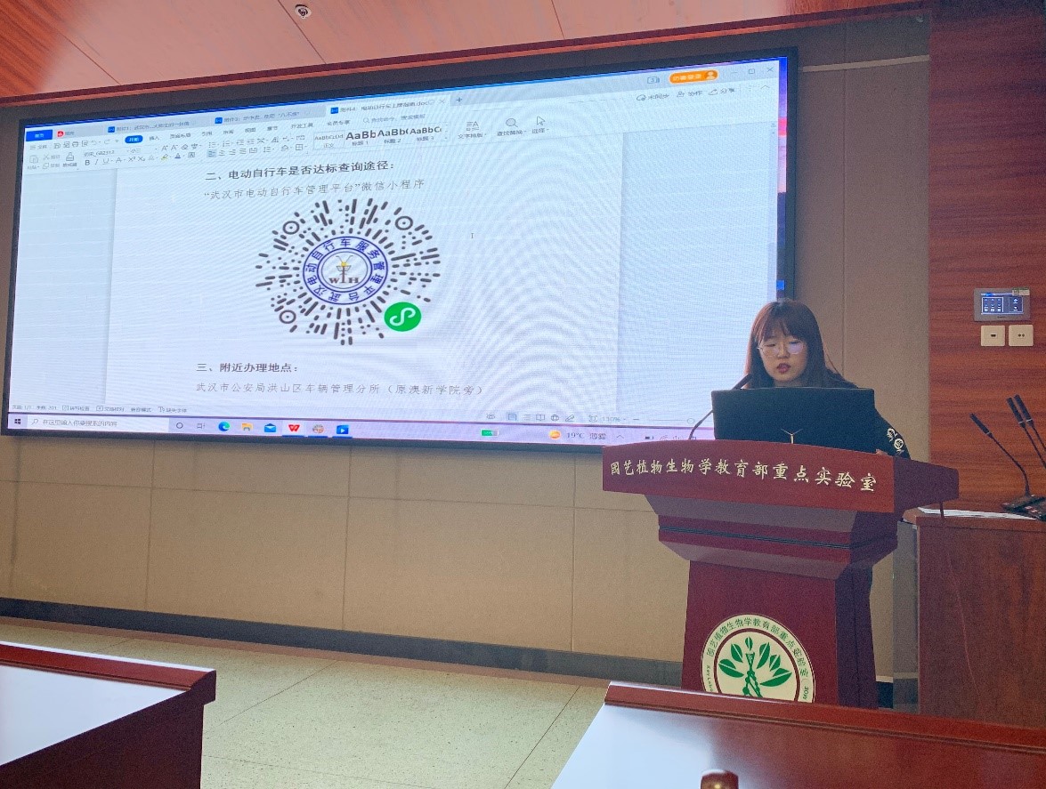 关会林向同学们宣读华中农业大学电动自行车安全使用“八不准”,带领同学们一起学习“八不准”条例。随后,她向同学们讲解电动车上牌指南,主要介绍了办理电动自行车上牌业务所需材料,查询电动自行车是否达标的途径以及学校附近的办理地点。听过介绍后,大家纷纷扫描二维码,登陆微信小程序“武汉市电动自行车管理平台”,线上查询自己购买的电动自行车是否达到标准,并纷纷相约去洪山区交通管理所为自己的电动自行车上牌。