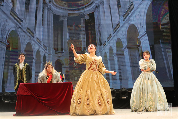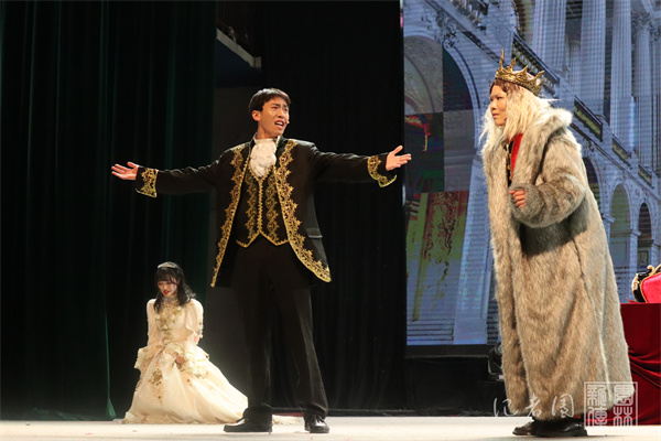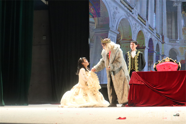 陈奕彰等同学在短短八分钟内生动诠释了三个性格迥然的女儿以及年老昏聩的李尔王的形象。故事讲述了年事已高的国王李尔王退位后,被大女儿和二女儿赶到荒郊野外,成为法兰西皇后的三女儿率军救父,却被杀死,李尔王伤心地死在她身旁。话剧情节清晰,内容跌宕,引人入胜。