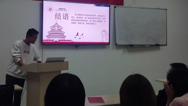 “三好研究生”荣誉获得者葛平飞同志向全体党员讲述走上科研道路的心路历程早在中学时期他便对大自然和生命万物产生浓厚兴趣,因而在大学时期他进入实验室跟着师兄师姐学习实验技能,研究生期间他开始进行园艺植物的相关研究。他认为,基础研究的作用会在以后的科研工作中慢慢体现,对于整个国家科技实力的提高具有重要作用。最后,他激励大家对科研保持兴趣,踏实进取,努力奉献,为党和国家做出应有的贡献!