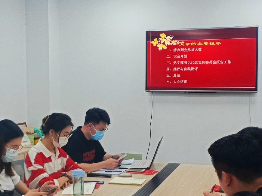 会议上,党支部书记田壮同志首先对2021年支部工作进行了述职汇报。汇报针对2021年度党员发展情况、十九届六中全会精神学习、支部活动三个方面所作的工作和取得的成绩进行了总结。同时各党支委对上学年支部工作进行了反思。其中,纪检委员赵小怡同志在会议中突出强调了参会纪律制度,她督促支部成员要重视支部活动,通过支部活动加强支部成员间的交流与了解。