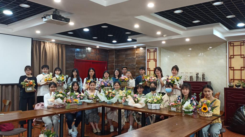 4月24日下午,园林院研究生 “掬花香满衣”学术晚茶活动在园林北楼120举行, 2020级农艺与种业研究生何兴群为同学们讲解了插花的流派、技法与搭配。同学们在讲解后利用现场提供的花材进行了自由创作,尝试修剪枝叶,搭配色彩,制作插花作品,在创作中融入自己的想法,每位同学都完成了属于自己的作品。