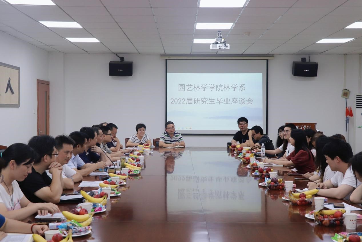 2022年6月19日下午,八八看球 林学系研究生毕业座谈会在园林北楼302会议室召开。院党委书记张宏荣、院长程运江、副书记蔡江、副院长王鹏程以及全体林学系老师、辅导员肖晗和20余位2022届毕业研究生参加了座谈会,会议由林学系主任杜克兵主持。
