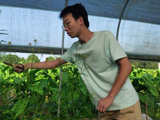 团队成员前期在团堡镇安乐坪村建了一个芥菜基地,用于每年夏季高山加代育种工作。团队成员根据芥菜材料的开花情况,分别进行了剥蕾授粉、套袋自交等工作,并在万正杰老师的带领下,学习了材料的纯度鉴定方法,观察了不同胞质不育芥菜材料的表型,深入田间工作,受益匪浅。