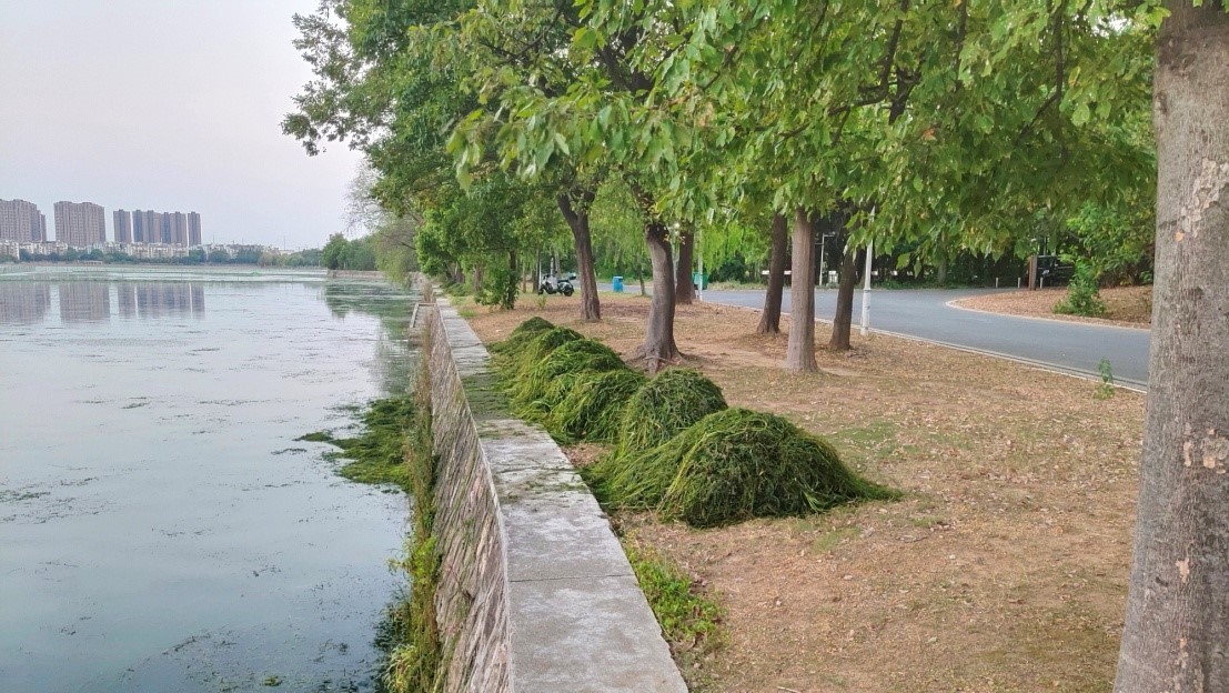 在南湖华农段,实践团发现工人们正在浅水区进行水草清除打捞工作,以确保南湖水清岸绿。据悉,南湖沿岸的浅水区种植了大量水草,可以起到修复水体的作用,但夏季水草长势旺盛,需要及时修剪抑制,以达到维护水域生态平衡的作用。