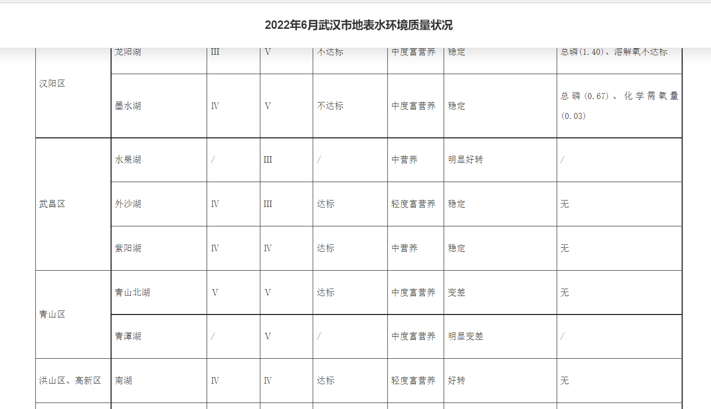 2022年6月武汉市地表水环境质量状况