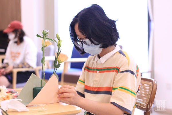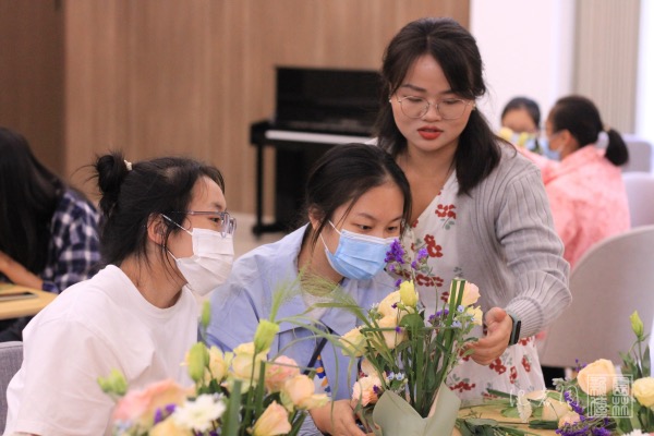 随后,同学们开始包装花泥修枝剪叶,感受插花艺术的魅力,体验插花过程给人带来的美学体验和心灵安宁。同学们尽情发挥想象力和创造力,呈现出一个个独具匠心的花艺作品,在创造美的过程中感受美、欣赏美。完善同学们作品的过程中杨雪建议大家:插花要注意插花的层次感要让花的姿态更趋近于自然的形式让作品四面皆可观