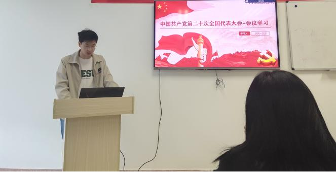 1023日晚,党支部于园林南楼421开展主题党日活动,本次活动主要学习习近平总书记在中国共产党第二十次全国代表大会上的报告,会议由李帅同志主持。