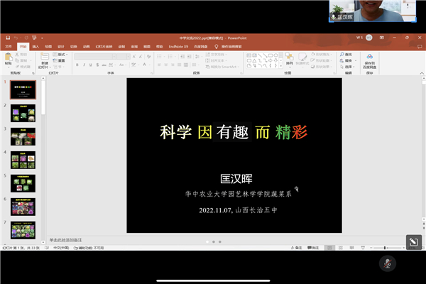 【核心提示】11月7日晚上7点,八八看球 蔬菜系教授匡汉晖通过腾讯会议向山西省长治市第五中学的高二年级学生开展“科学因有趣而精彩”主题讲座。
