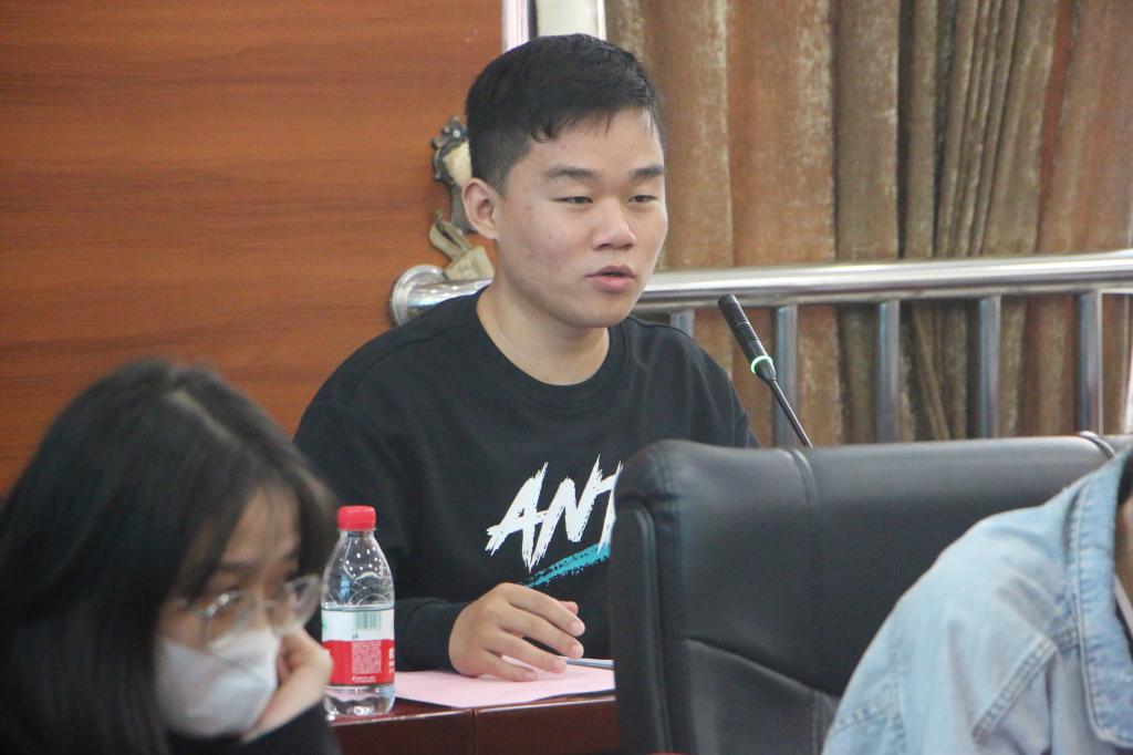 随后,记者代表覃语祺分享其个人成长事迹。覃语祺从生活角度分享自己认为的记者,继而讲述到自己正式接触记者相关工作的经历。她在大一期间加入学校的学通社,并在学校运动会上第一次的采访经历让她在今后的采访中学会了提前了解被采访者的背景。同时,采访经验上,她认为采访更像是一个与被采访者之间的交流互动,从而在这过程中能够更加真实的了解对方。采访后的报道编写,她认为可以先参考之前的相关材料,对比与之前活动的特别之处,突出表达其特点。描写场面时候,多采用动词,让读者能有身临其境的感觉。最后,她说到:“记者的门槛并不高,需要我们勇敢地迈出第一步,跳出自己的舒适圈,勇敢用笔和镜头记录生活中的感人瞬间,讲述新时代校园里的奋进故事。积极地传达校园正能量,让我们的声音能被更多人听见。”