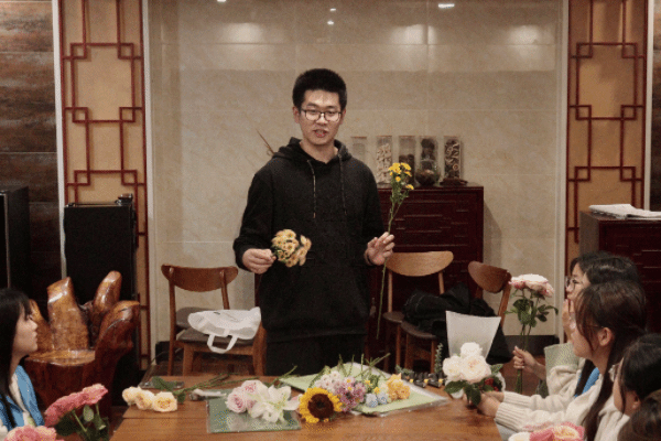 花材介绍结束之后,队员们开始动手实操进入花束制作环节。教学志愿者拿着花材和枝剪,细致的跟队员们讲述如何剪花枝,如何将三枝花摆放到一个看起来美观的位置,以及如何加上配草使得花束看起来更加灵动,花束制作过程中的注意事项等等内容。大家兴致勃勃地按照志愿者所说的方法制作着。教学志愿者很耐心地给大家解答并且提供必要的帮助。之后大家将花束插进花泥,便开始包装花束。先用一层玻璃纸包好花泥起到保水作用,再用包花专用纸进行最终的包装。王湛宇学长给大家展示了包装纸的叠法,队员们专注地包装着属于自己的花束,大家的花束各有特点,极具特色。