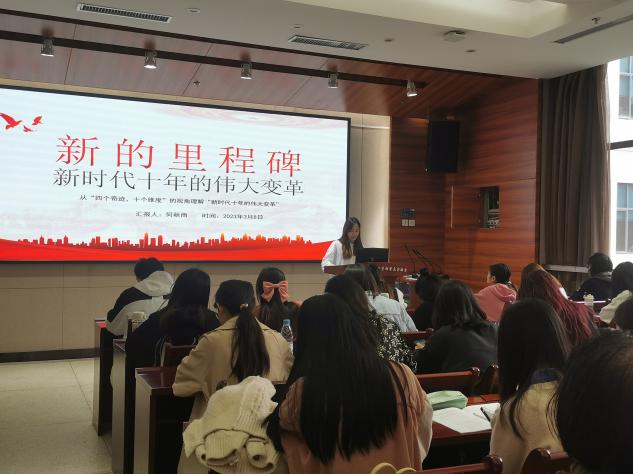 宣讲结束后,同学们都感触颇深,十年弹指一挥间,回首这十年,每一张成绩单都镌刻着中国奋进的足迹。在中华民族伟大复兴的历史征程上,中国人民书写下极不寻常、极不平凡的时代篇章。最后,陈沁怡同学谈到:“一切过往,皆为序章。过去的精彩,只代表昨日的努力,今日的精彩和明日的辉煌,还需要在我们的手中创造。我们要以冲锋姿态、奋斗状态砥砺前行,让每一个‘我’在新时代新征程中跑出更耀眼的好成绩。”
