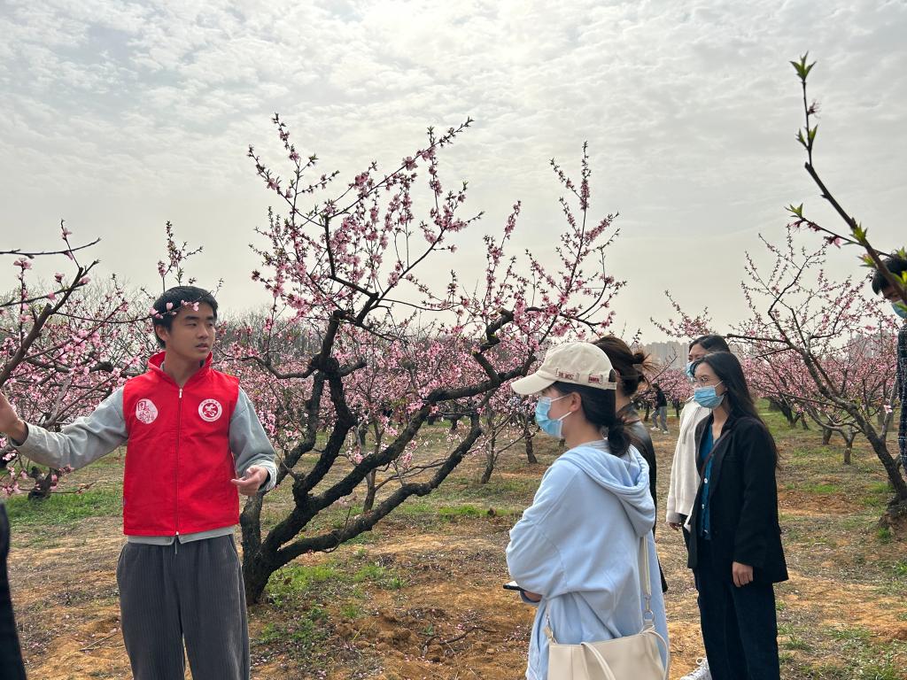 上午9:30分,志愿者李寄凡同学带领大家在桃花园进行科普讲解。李寄凡谈到,桃花原产于中国中部及北部,栽培历史悠久,其具有很好的实用价值,既可食用,又可药用,《神农百草经》里就谈到,桃花具有“令人好颜色”的作用。桃花色彩艳丽,是早春重要的观花树种,人们也用它来象征春天的到来。