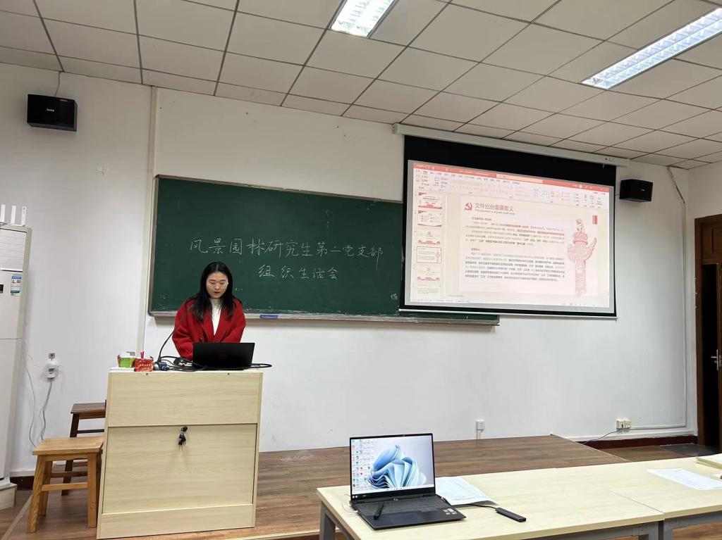3月24日,风景园林研究生第二党支部在景园楼309教室召开2022年度组织生活会,本次会议主要分为4项,集体学习2023年中央一号文件、习近平总书记对深入开展学雷锋活动做出的重要指示、党的二十大会议精神、全国两会精神等内容,支委会带头进行批评和自我批评。会议由支部书记胡泽众主持,刘一凯进行记录。